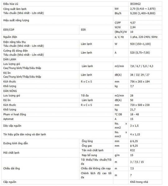 Thống số kỹ thuật Điều hòa LG 9000BTU 1 chiều inverter IEC09G2