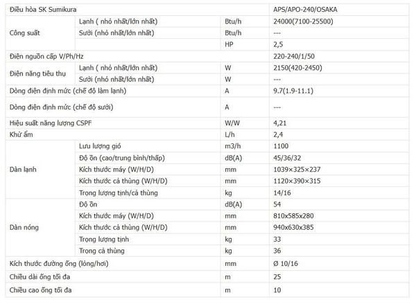 Thống số kỹ thuật Điều hòa Sumikura 24000BTU 1 chiều inverter APS/APO-240 OSAKA