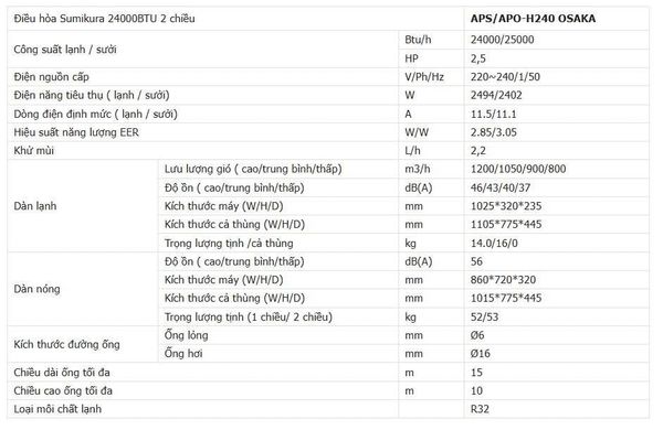 Thống số kỹ thuật Điều hòa Sumikura 24000BTU 2 chiều APS/APO-H240 OSAKA